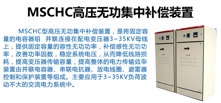 MSCHC型高壓無功集中補償裝置,是將固定容量的電容器組 并聯連接在配電變壓器3~35kV母線上,提供固定容量的容性無功功率,補償感性無功功率,改善功率因數,穩定系統電壓,從而降低線路損耗,提高變壓器傳輸容量,提高整體的電力傳輸效率。裝置由并聯電容器、串聯電抗器、放電線圈、避雷器、控制和保護裝置等組成。主要應用于3~35kV負荷波動不大的交流電力系統中