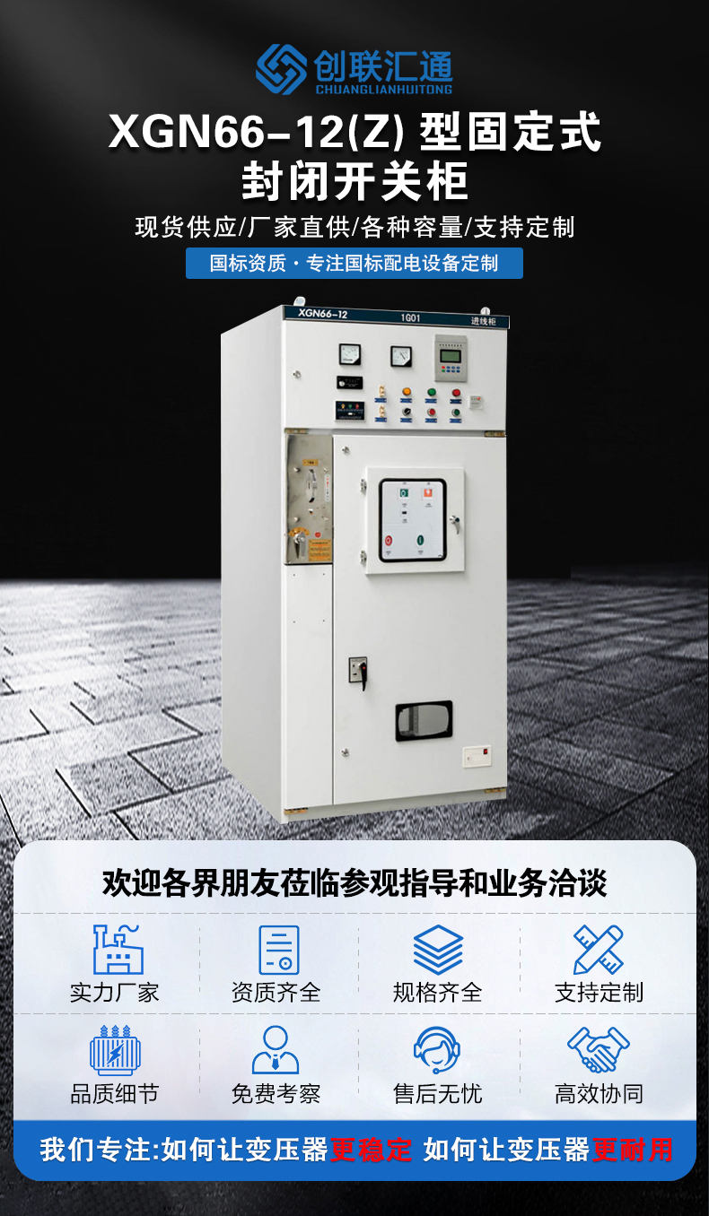 XGN66-12(Z)箱型固定式金屬封閉開(kāi)關(guān)設(shè)備(簡(jiǎn)稱(chēng)開(kāi)關(guān)柜)用于3、6、10kV三相交流50Hz系統(tǒng)中作為接受與分配電能之用。其母線(xiàn)系統(tǒng)為單母線(xiàn)(可派生出單母線(xiàn)帶旁路和雙母線(xiàn))結(jié)構(gòu)。