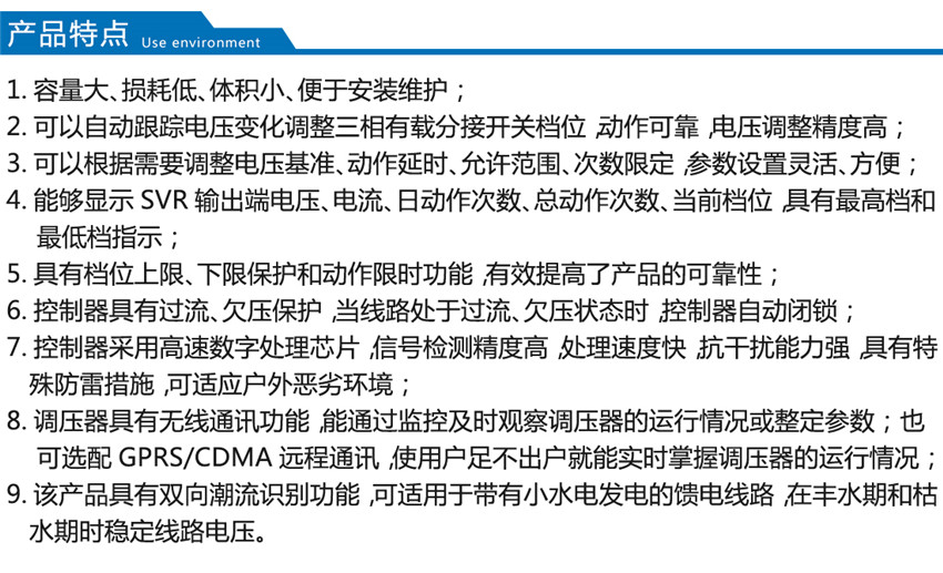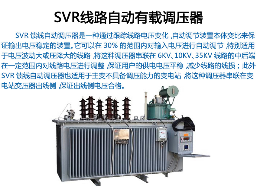 我公司生產的SVR型線路自動調壓變壓器原理是SVR與10kV 柱上無功自動補償裝置GWJ配合使用,可有效地解決線路電壓低及無功電源不足的問題。SVR 能有效地調節電路電壓, GWJ無功補償裝置能有效補償無功,提高功率因數,降低線損,其效果相當于一個簡易的柱上變電站,而造價僅為常規變電站的1/6~1/10。而成本只有變電站的1/6,1/7,而且無需工作人員值班維護。