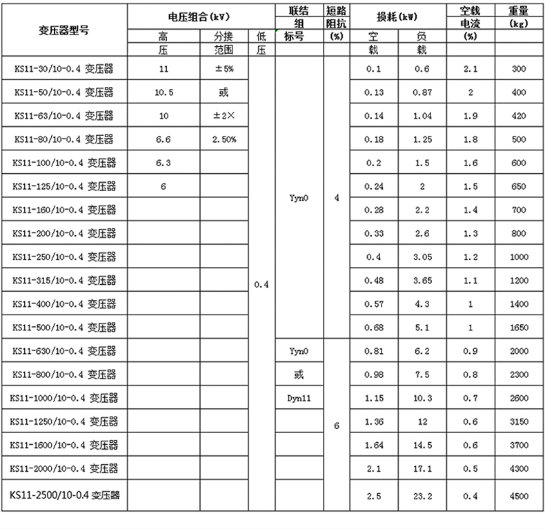 KS11系列10KV礦用變壓器KS11系列礦用變壓器,作為礦并的配電設備.該產品具有體積小,易下并,結構合理、損耗低.教熱性能好等特點。本系列產品采用優質的晶粒取向優質高導磁性能硅鋼片疊裝而成,鐵芯為芯式鐵芯,全斜接縫迭積式鐵芯,其鐵芯柱為多級圓截面,確保低噪音低損耗油箱結構堅固,箱壁兩側焊有高、低壓電纜接線盒,作為電纜接線之用,高壓線圈須有額定電壓士5 %的分接電壓,利用分接開關變換電壓變換電壓時.必須先切斷電源,然后去除箱壁上分接開關的風雨雙進行變換電壓變壓器低壓側允許"Y” 型接成693V或”D”型接成400V供電,在電纜接線盒內直接裝次級端頭引出六個瓷套供用戶改接變壓器吊裝利用焊在箱壁的吊攀,變壓器箱底均裝有拖撬,在拖撬上備有安裝孔,可供礦并需要時加裝礦車滾輪。