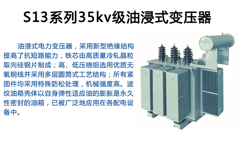 S13油浸式全密封配電變壓器,不同于普通油浸式變壓器,它取消了儲油柜,由油箱體的波紋板式散熱片來散熱冷卻,其彈性脹縮補償油體積的增減。各系列產品適用在10KV、20KV、35KV輸配電系統中,可供居民區、商業街道、工礦企業和農村動力及照明之用。