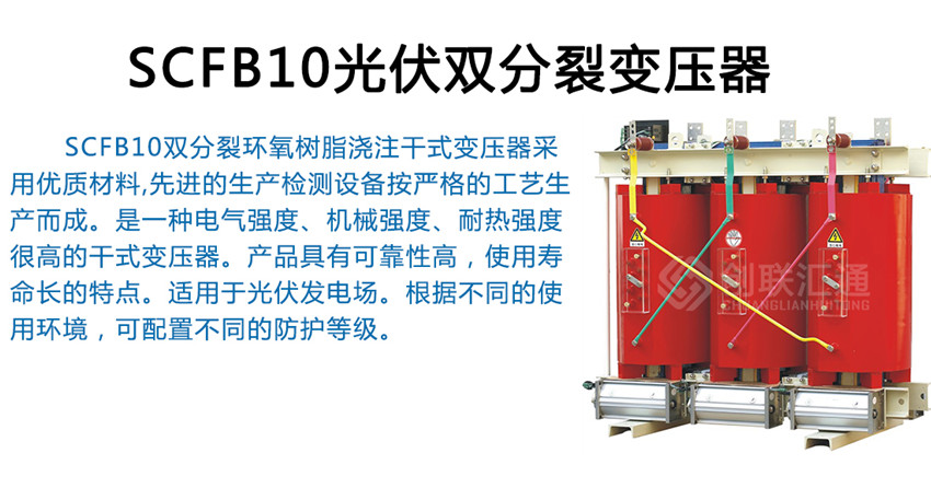 SCFB10雙分裂環(huán)氧樹脂澆注干式變壓器采用優(yōu)質(zhì)材料,先進(jìn)的生產(chǎn)檢測(cè)設(shè)備按嚴(yán)格的工藝生產(chǎn)而成。是一種電氣強(qiáng)度、機(jī)械強(qiáng)度、耐熱強(qiáng)度很高的干式變壓器。產(chǎn)品具有可靠性高,使用壽命長(zhǎng)的特點(diǎn)。適用于光伏發(fā)電場(chǎng)。根據(jù)不同的使用環(huán)境,可配置不同的防護(hù)等級(jí)。