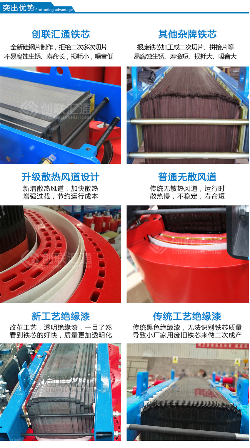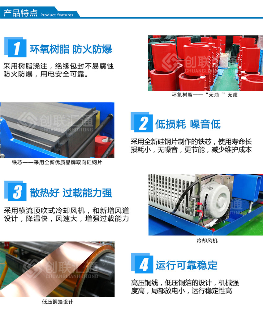 雙分裂環(huán)氧樹脂澆注干式變壓器的設(shè)計(jì)符合實(shí)際應(yīng)用并具有以下技術(shù)特性: